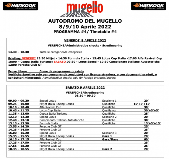 Domenica Dalle 9:00 alle 18:45 le gare di Lotus Cup, Club Porsche GT, Mitjet Italia, Coppa Italia Turismo e Campionato Italiano Autostoriche.