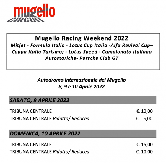 La prevendita online è già iniziata https://www.ticketone.it/artist/mugello-racing-weekend/ Sarà possibile acquistare i biglietti anche direttamente all’ingresso principale presso il Casco, nelle giornate di sabato e domenica.